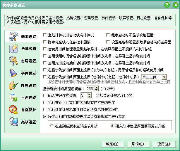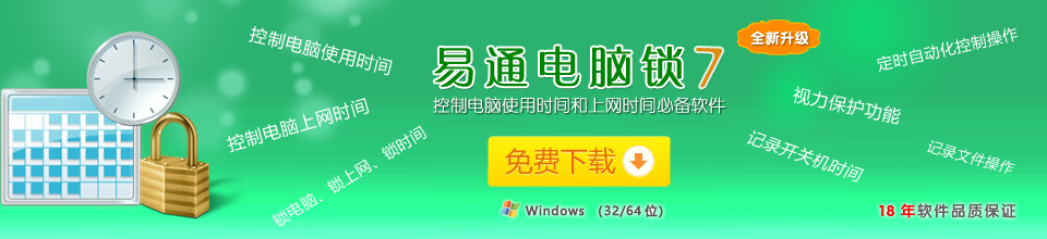 控制管理电脑使用时间和上网时间必备软件。软件集电脑使用时间和上网时间管理(可按时间段、累计使用时间、自定时间等方式来控制)、视力保护(每累计使用一段时间电脑强制锁定一段时间电脑)、定时多任务管理(定时关机/锁机/重启/注销/提醒/打开或关闭程序/删除文件或文件夹/备份文件或文件夹等)、记录电脑开关机时间和使用时间、记录文件操作日志(新建/复制/删除等)等功能,是您电脑安全和使用管理的理想选择。查看软件界面截图>>