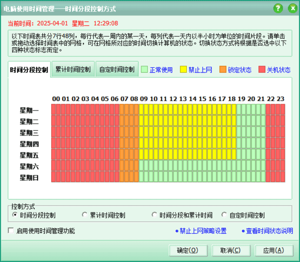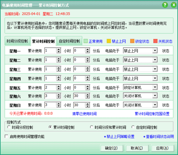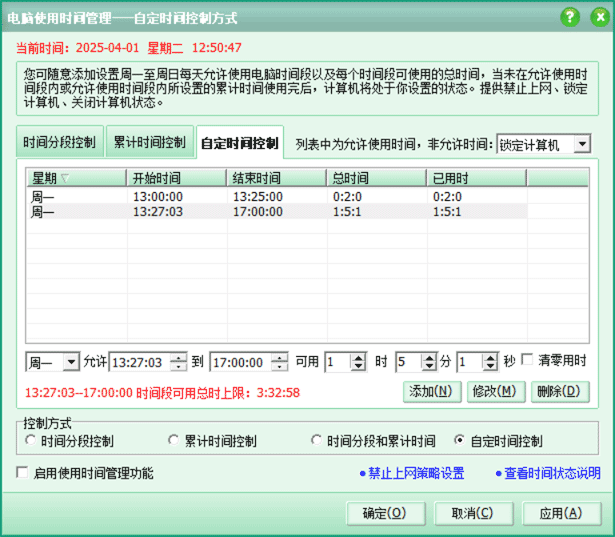 使用时间管理功能增加自定义时间控制方式,可随意指定允许使用的时间段以及时间段内可用总时间。