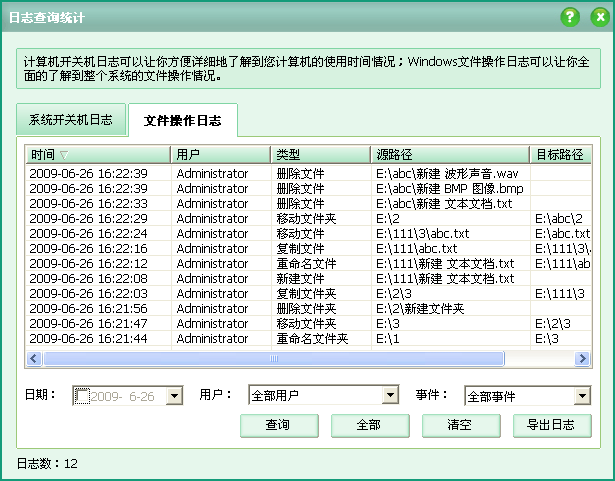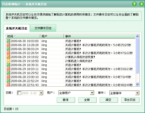 系统开关机日志记录了计算机的开关机时间和使用时间等,可以让你方便详细地了解到您计算机的使用时间情况;文件操作日志记录了文件的新建/复制/删除等操作,可以让你全面的了解到整个系统的文件操作情况。