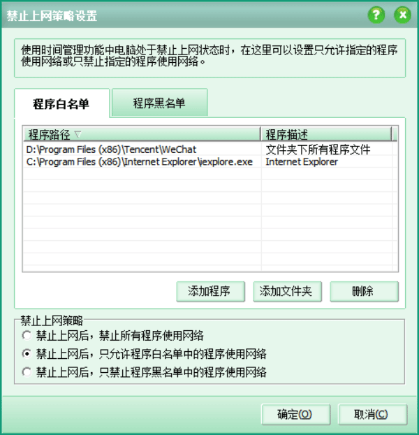 禁止上网策略设置配合上网时间管理功能可以实现在规定的时间里只允许指定的程序使用网络或只禁止指定的程序使用网络,控制非常灵活。