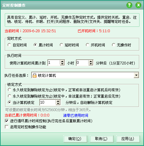 提供了自定、累计、延时、开机、系统无操作五种定时方式。定时任务提供了定时关机、重启、注销、锁定、待机、休眠、提醒、打开或关闭程序、删除文件/文件夹、备份文件/文件夹、断开网络拔号连接等操作任务。
